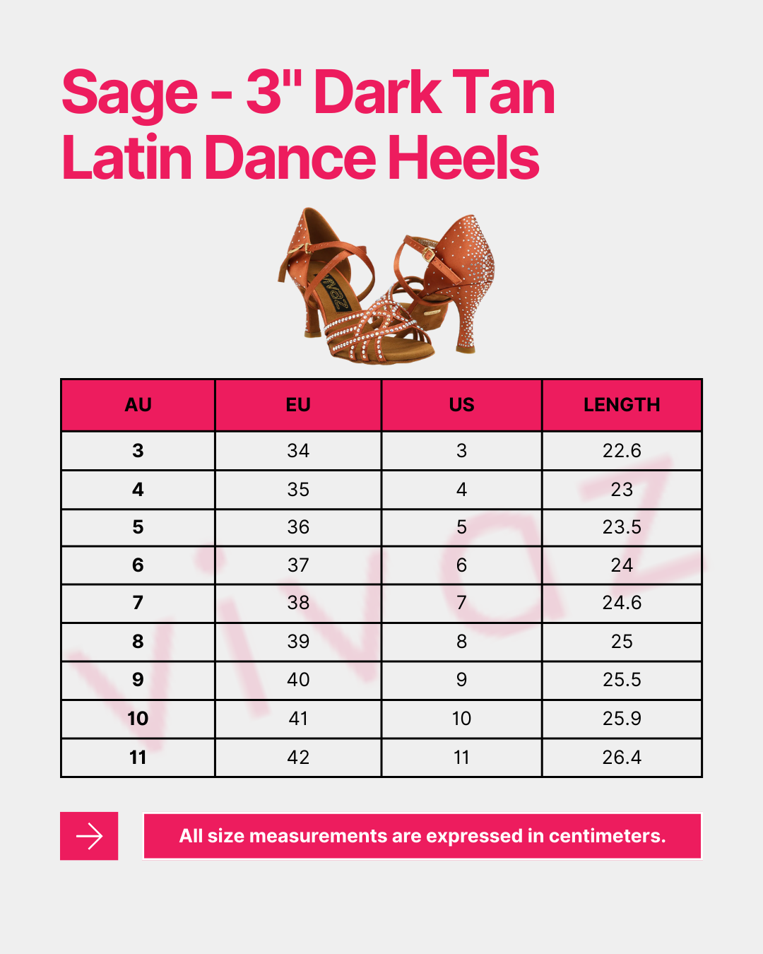 Sage is made in EU sizing and is true to size, designed for a firm, snug fit—just as dance shoes should be. If you prefer a tighter fit, consider ordering your usual size or one size down.