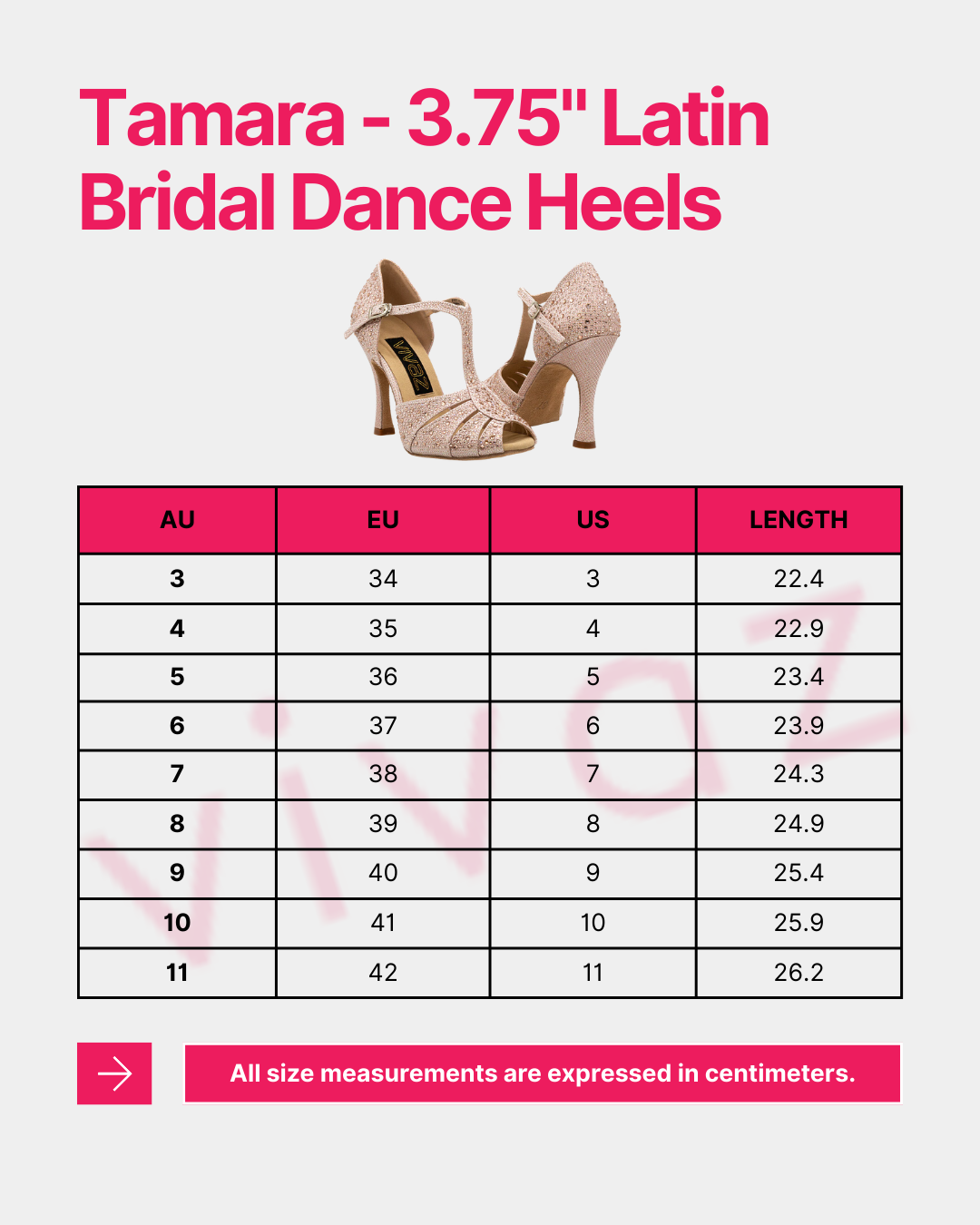 Tamara is made in EU shoe sizing and is a firm fit. Please note that dance shoes need to fit firm and snug. We recommend ordering your usual shoe size in Tamara, or one size up if you have a wide foot.